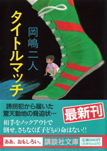 HOME | 岡嶋二人 | タイトルマッチ | タイトルマッチ 初出誌・野生時代 1984年3月号 カドカワノベルズ 1984年6月25日 カバーイラスト:浅賀行雄 定価:693円 ISBN-10: 4047770019 徳間文庫 1989年2月15日 解説:新保博久 カバー装画:長尾みのる 定価:571円 ISBN-10: 4195686954 解説を読む 講談社文庫 1993年12月15日 解説:茶木則雄 カバー装画:長尾みのる 定価:620円 ISBN-10: 4061855433 解説を読む 作品の冒頭を立読みできます 書店の在庫を調べる ネットで本を買う
